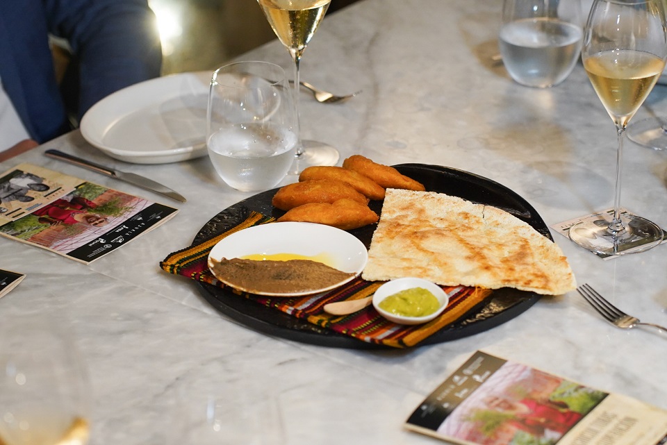 El plato de la noche, elaborado por el chef Saverio Stassi, fue: empanada de maíz, rellena de ropa vieja de chivo, casabe, guacamole y crema de berenjena.