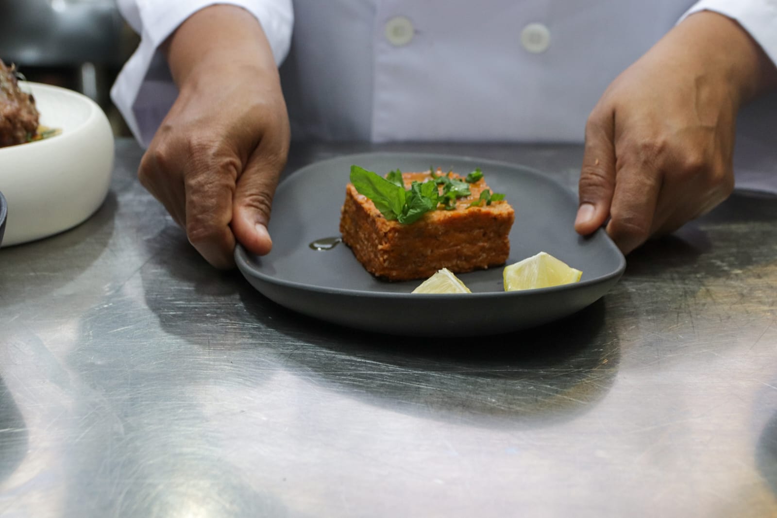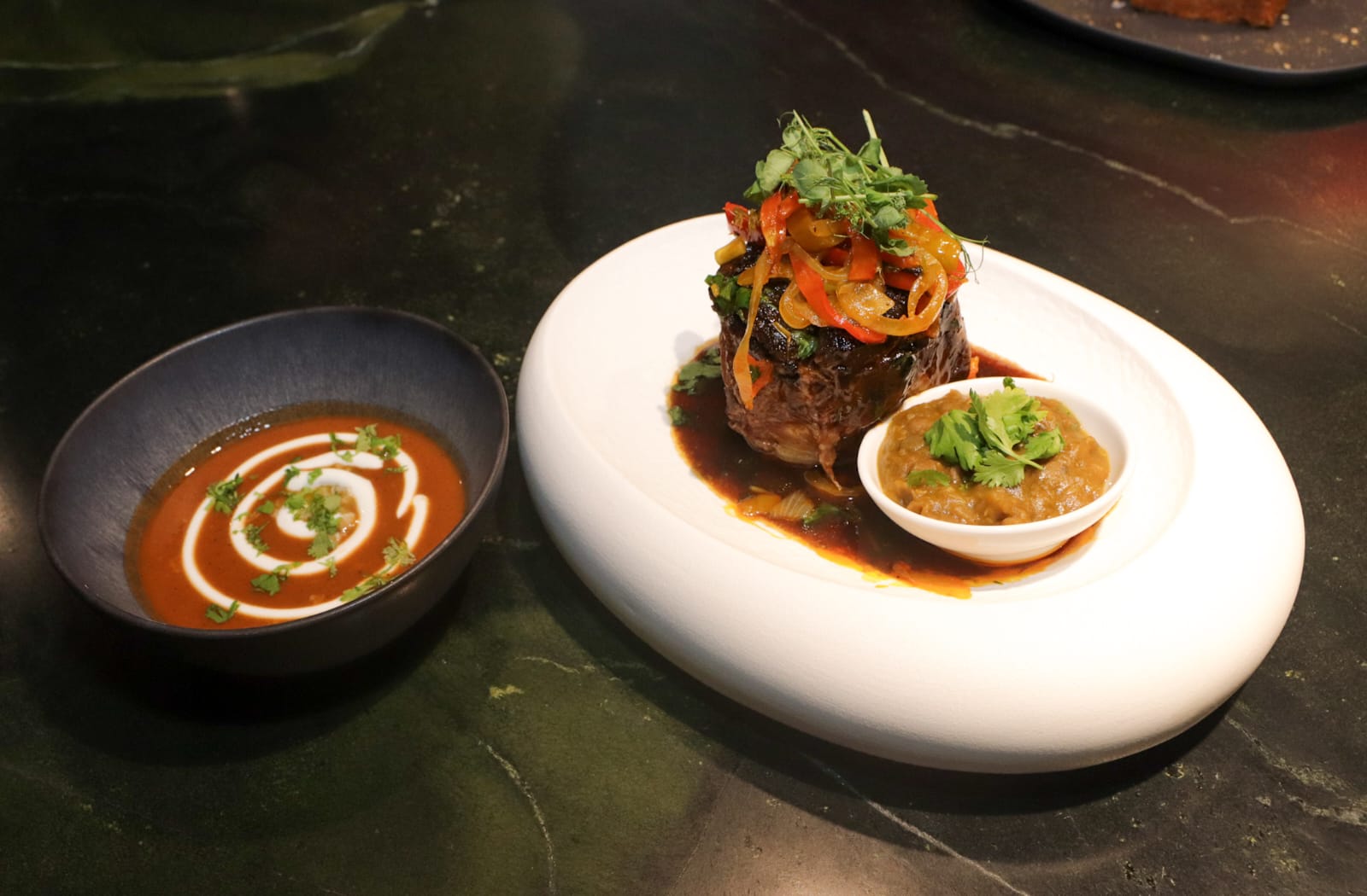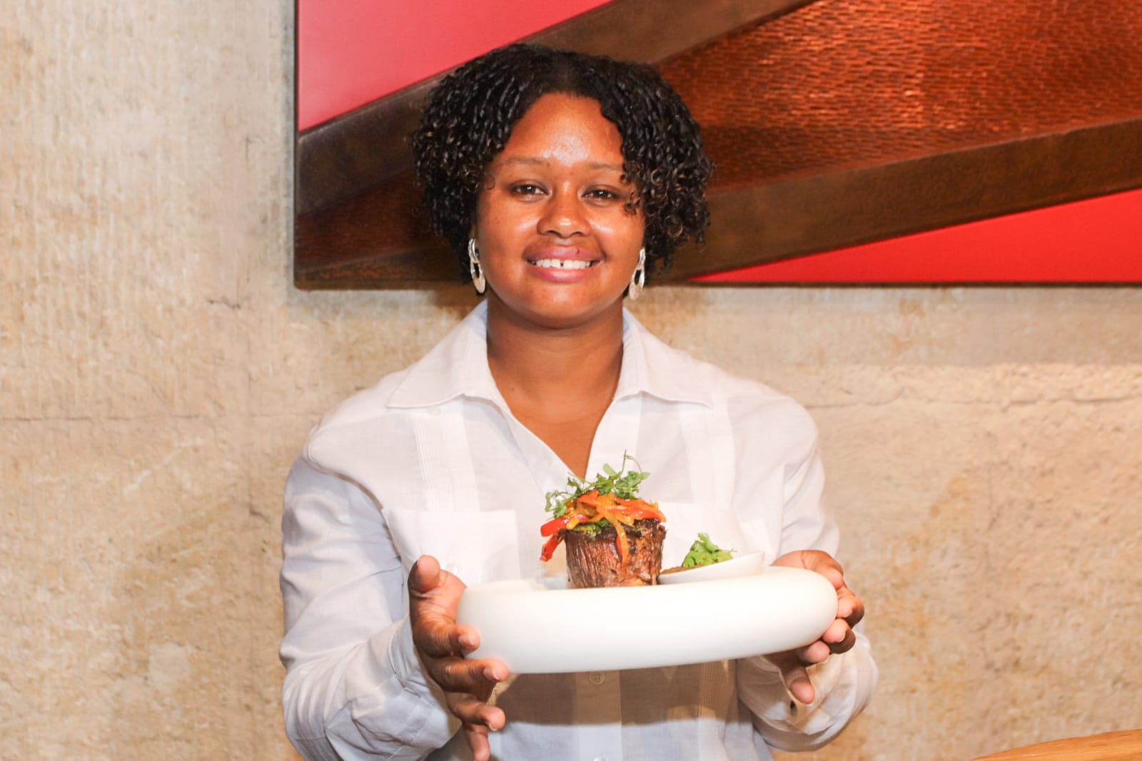 Los platillos de la noche fueron elaborados por el chef y propietario del establecimiento Saverio Stassi, el cual contó con una entrada compuesta por sopa de tortilla de langosta e hierbas de campo, dos platos fuertes: pasta de tortellini de carne en caldo de parmesano y codillo asado sobre triple de vegetales del campo rostizado y como postre banano tentación.
