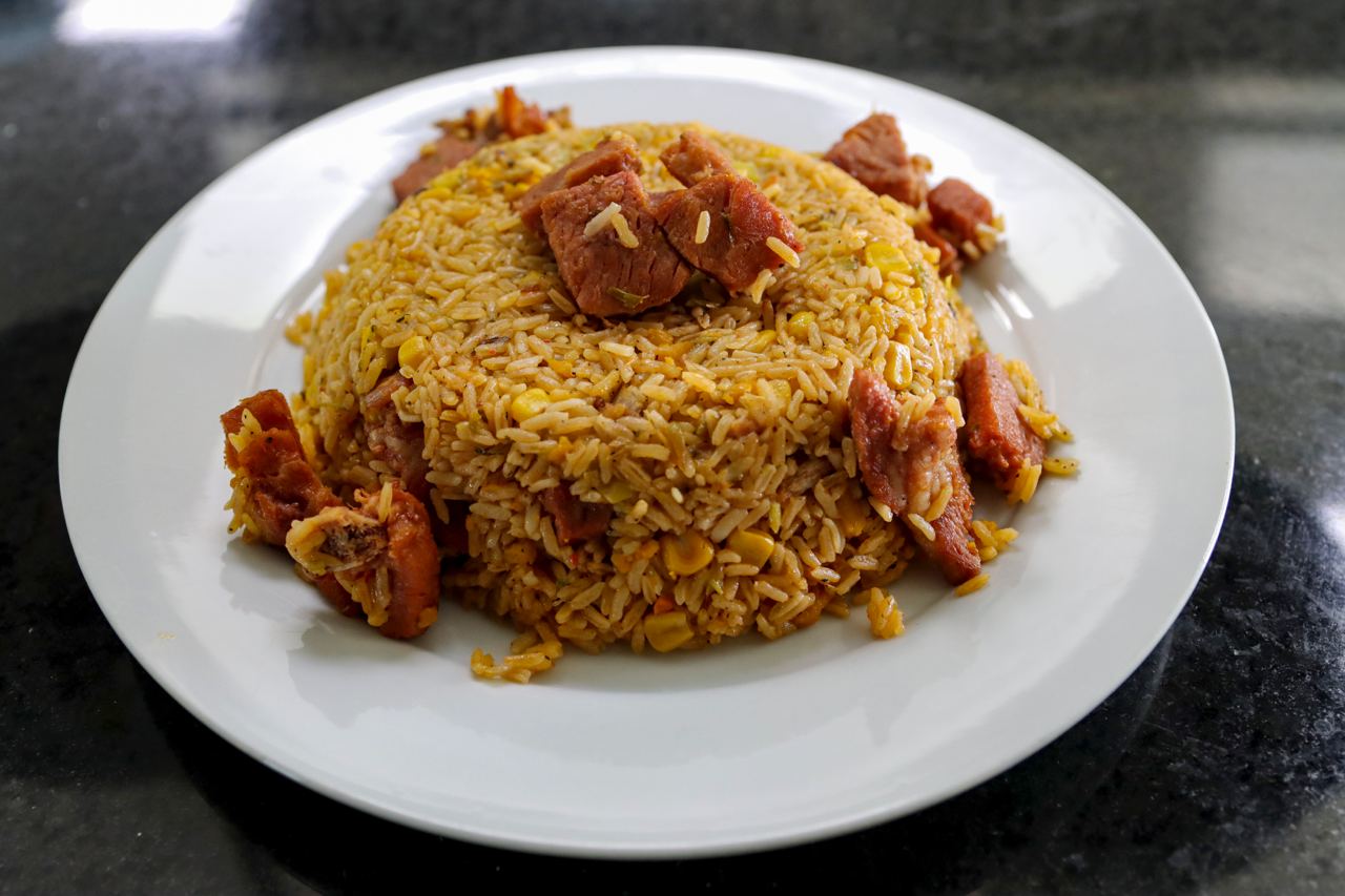 De manera simultánea, el chef Pedro Hernández impartía el curso de cocina dominicana a estudiantes que observaban cómo elaborar un delicioso “Arroz tres delicias” a la dominicana. Este plato, explicó, integra al pollo, al huevo y al jamón. El locrio de cerdo con maíz, acompañado de una ensalada verde también estuvo presente en el menú del día.