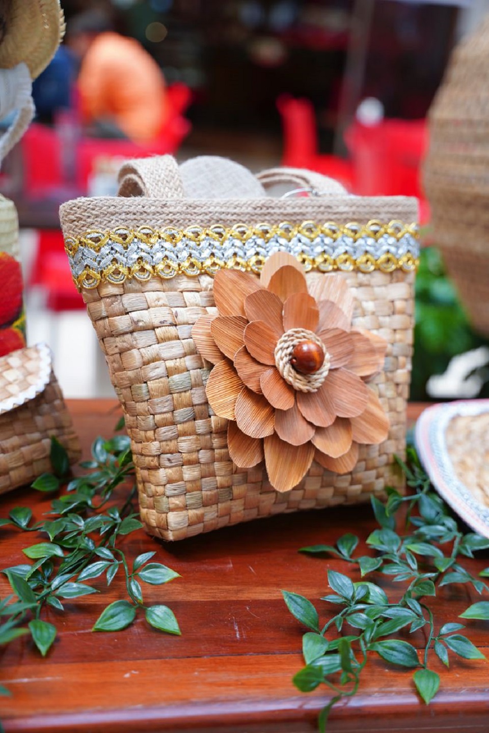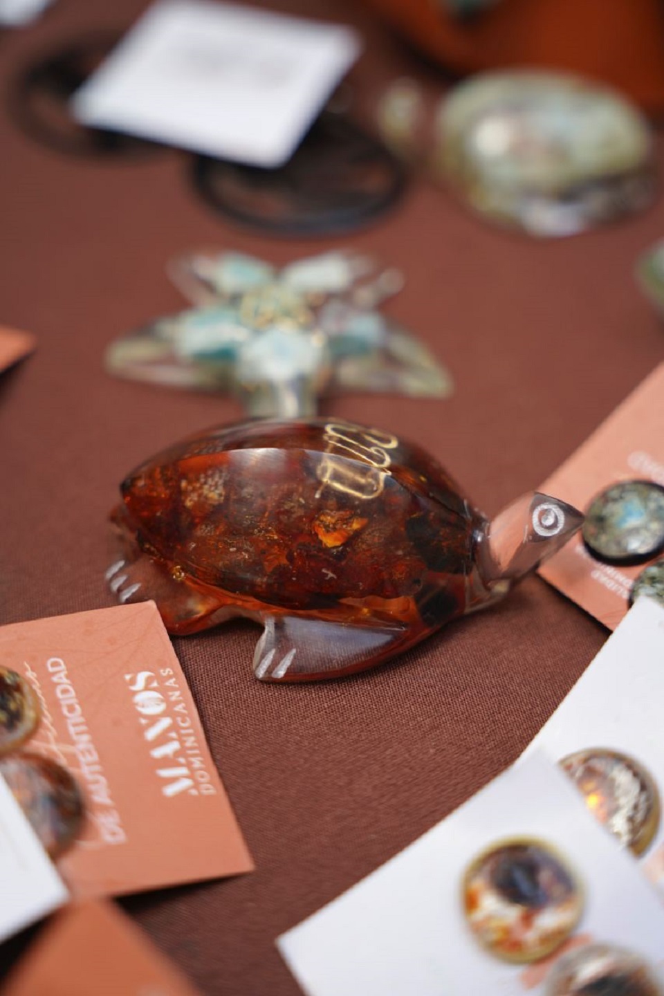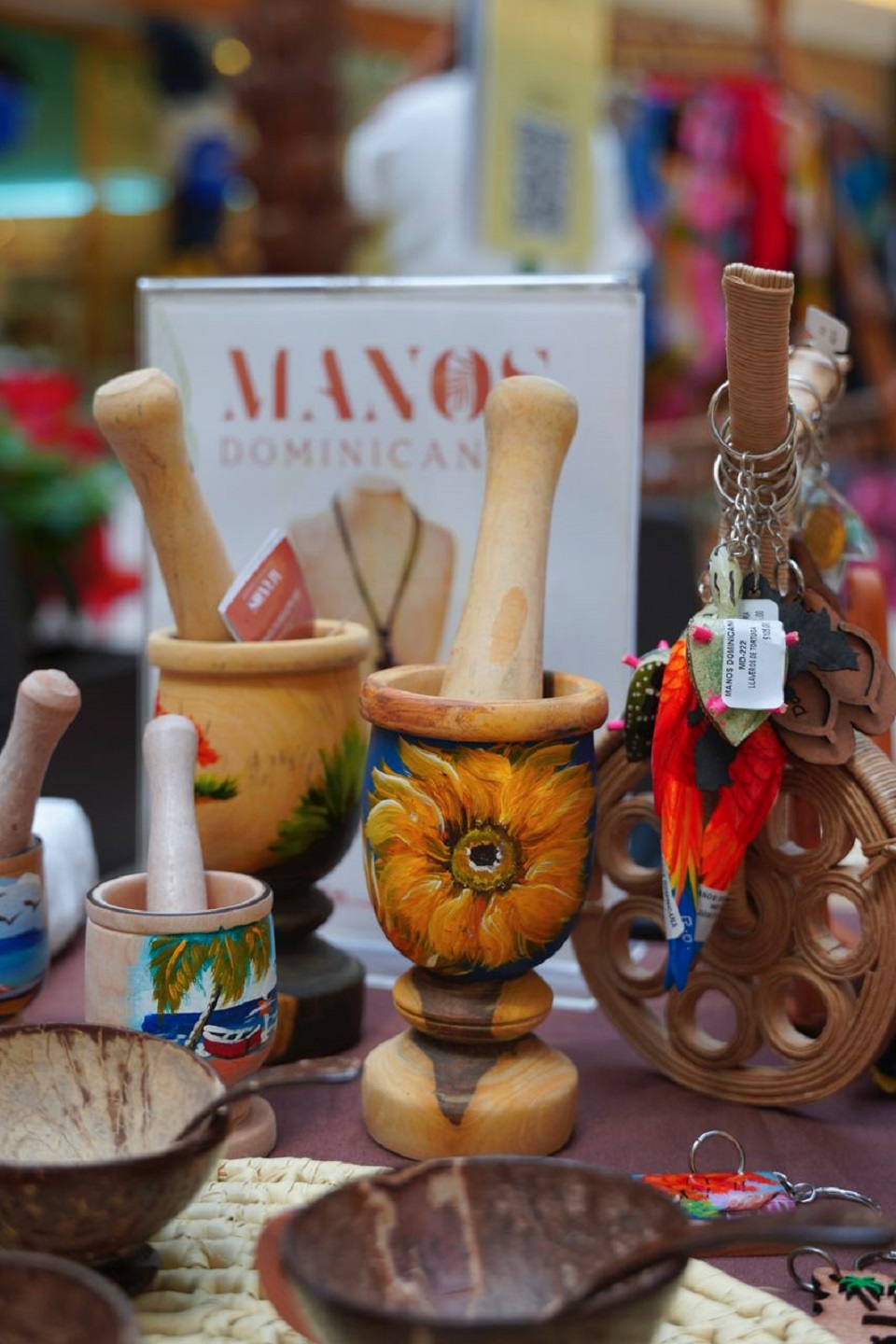 En su espacio, asignado en el primer nivel de la plaza comercial, Manos Dominicanas muestra y comercializa piezas elaboradas por artesanos y artesanas que forman parte de las iniciativas de Supérate, incluyendo llaveros, carteras, sombreros, grecas, pilones, aretes y collares, en fibras de guano, cuerno de vaca, flejes de papel, larimar, resina, jícara de coco, madera y lilas de agua.